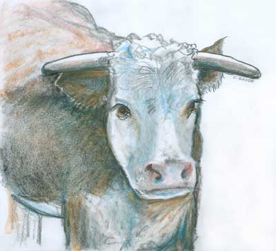 north to graze in the open range, many of them with adorable calves ambling alongside. Often, several of them will find a gap in the boundary fence and make their way through the neighborhood, eating as much of the delectable plantings from yards and gardens as they can before "Dusty" (our local wrangler) herds them on back to national forest land. Usually, they are very timid, like this Hereford mama who kept a watchful eye on me, while her calf was udder feeding. When her calf was done, they both came over to say 'hello'... mooing sweetly to each other, and to me. |
